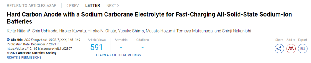 豐田汽車公司于 2021 年 12 月發(fā)表的論文表明,該車企強調(diào)全固態(tài)鈉離子電池AS3Ibs的快速充電性能。由于鈉離子在固相中的快速擴散,與傳統(tǒng)的鋰離子電池相比,全固態(tài)鈉離子電池具有實現(xiàn)快速充電的潛力。但是AS3Ibs電池面臨著與電池活性材料、固體電解質(zhì)之間較低的接觸面積。豐田汽車公司Keita Niitani等展示了使用硬碳負(fù)極和碳硼烷鈉固態(tài)電解質(zhì)的快充AS3Ibs,表明當(dāng)活性材料和固態(tài)電解質(zhì)之間形成適當(dāng)?shù)慕缑鏁r,AS3Ibs具有作為快速充電電池的高潛力。