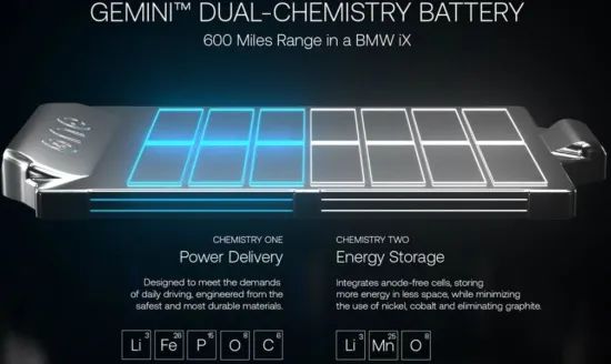 ONE Gemini雙化學(xué)電池由循環(huán)特性優(yōu)良的磷酸鐵鋰電池和能量密度更高的無負(fù)極錳基鋰電池兩種電芯組成的電池系統(tǒng)。后者在將鎳 (Ni)和鈷(Co)的用量壓縮到最低的情況下,實現(xiàn)了超過1000Wh/L的高能量密度。該汽車在日常通勤和城市駕駛時主要使用LFP,而在長途駕駛等少數(shù)情況下則同時使用無負(fù)極電池。當(dāng)ONE的Gemini雙化學(xué)電池技術(shù)整合到純電動寶馬iX中,能帶來600英里續(xù)航表現(xiàn)(約966公里)。