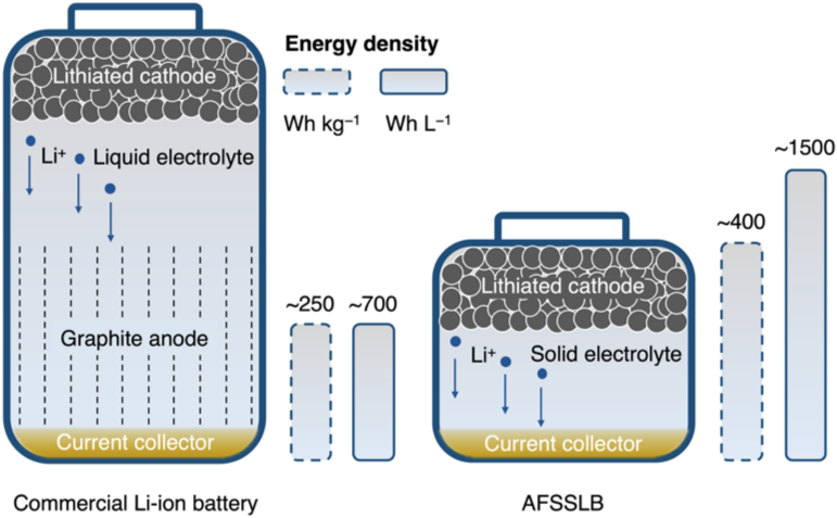 事實上,無負(fù)極電池最早應(yīng)用于鋰離子電池。金屬鋰負(fù)極的使用對于大幅提高電池的能量密度非常關(guān)鍵。為提高金屬鋰沉積和脫出的效率,必須綜合考慮存在的挑戰(zhàn),以促進有利的金屬鋰沉積形態(tài),確保形成良好的共形界面,保證鋰離子的順利傳導(dǎo)。目前提高循環(huán)性能的策略主要集中在:(1)電解質(zhì)設(shè)計,(2)界面修飾,以及(3)集流體改性。如固態(tài)無負(fù)極鋰電池(Anode-free solid-state lithium battery, AFSSLB)的研究是突破電池續(xù)航焦慮和安全隱患的重要前沿陣地之一。相比商業(yè)液態(tài)鋰離子電池250kW/kg和700kW/L的能量密度,固態(tài)無負(fù)極鋰電池(AFSSLB)的能量密度能夠達到400kW/kg和1500kW/L。