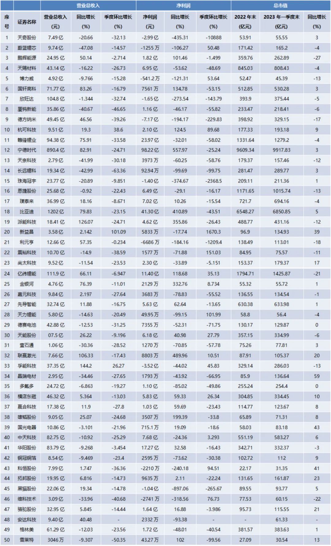 電池的上市公司一季度經(jīng)營(yíng)指標(biāo)。從整體表現(xiàn)看,超過(guò)一半的鋰電企業(yè)凈利潤(rùn)從凈賺數(shù)億轉(zhuǎn)為虧損數(shù)億。