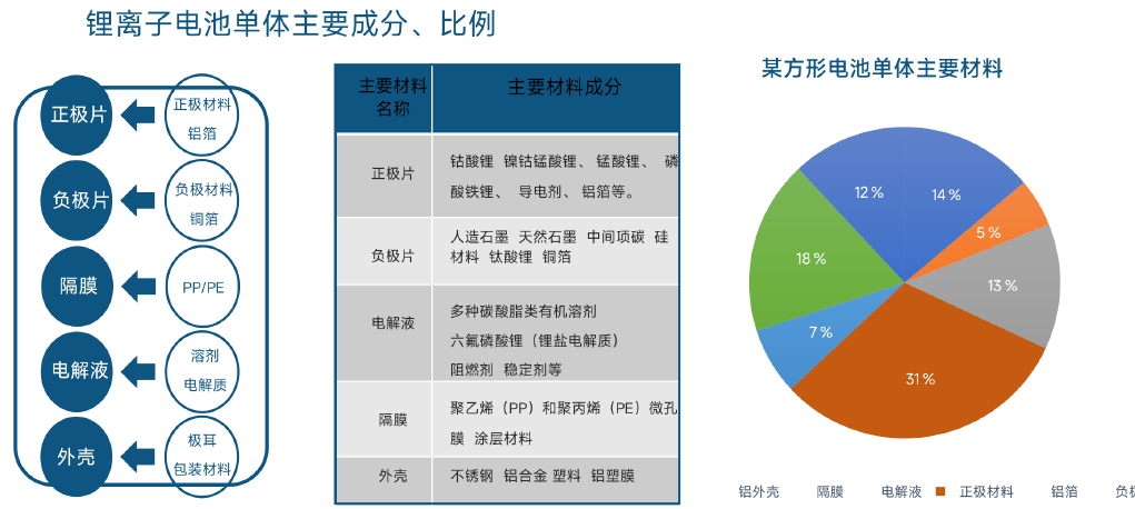 從結(jié)構(gòu)來(lái)看,鋰離子電池單體由正極片、負(fù)極片、電解液、隔膜和外殼組成。其中,正極片主要材料成分是鈷酸鋰、鎳鈷錳酸鋰、錳酸鋰、磷酸鐵鋰、導(dǎo)電劑、鋁箔等;負(fù)極片主要材料成分是人造石墨、天然石墨、中間項(xiàng)碳、硅材料、鈦酸鋰、銅箔;電解液主要材料成分是多種碳酸脂類有機(jī)溶劑、六氟磷酸鋰(鋰鹽電解質(zhì))、阻燃劑、穩(wěn)定劑等;隔膜主要材料成分是聚乙烯(PP)和聚丙烯(PE)微孔膜、涂層材料;外殼主要材料成分是不銹鋼、鋁合金、塑料、鋁塑膜。