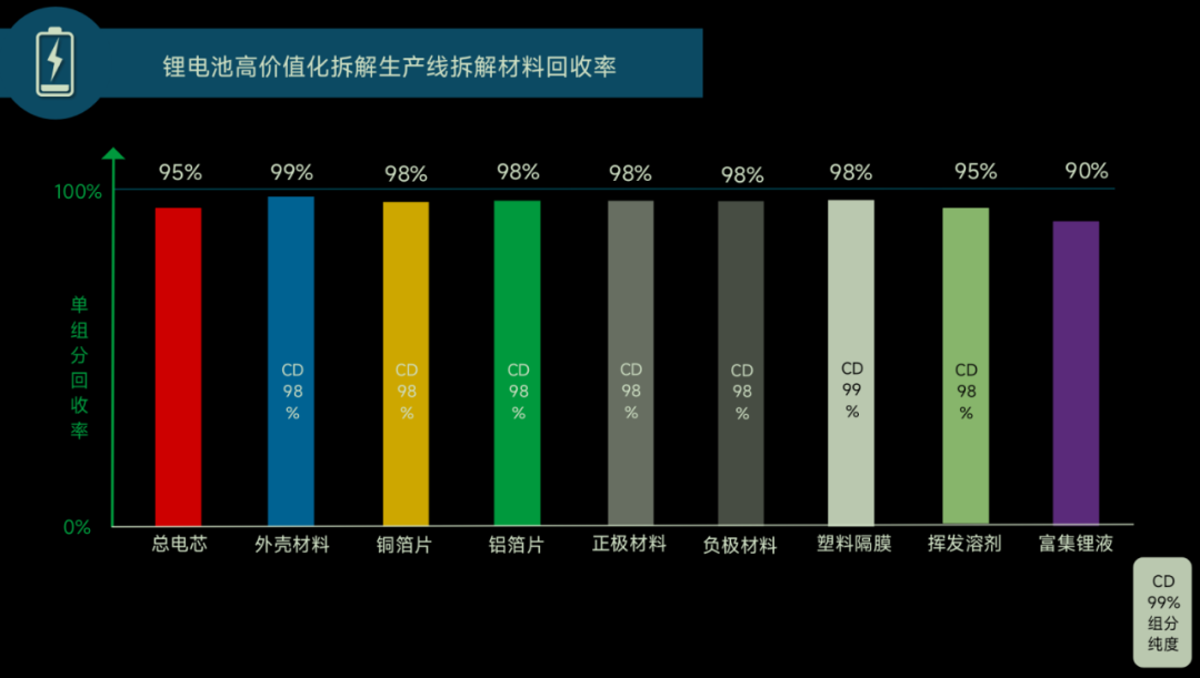 在演講中,郭杰指出,鋰離子電池再生利用終極解決方案的評(píng)價(jià)標(biāo)準(zhǔn)是安全、環(huán)保、固廢資源化率。終極解決方案分兩步走,一是對(duì)電池全組分精細(xì)化拆分回收,二是對(duì)各組分的再生利用。鋰電池高值回收自動(dòng)化生產(chǎn)線,可回收電池全組分材料,總體回收率及純凈度均達(dá)95%以上,其拆解回收工藝流程及物料轉(zhuǎn)化過(guò)程不破碎、無(wú)燃燒微排放;拆解回收的材料有正極材料、濾波片、銅箔片、負(fù)極材料、正極材料、有機(jī)溶劑、外殼材料和富集鋰液這8種,單項(xiàng)材料回收率最高達(dá)到99%(見(jiàn)下圖)。