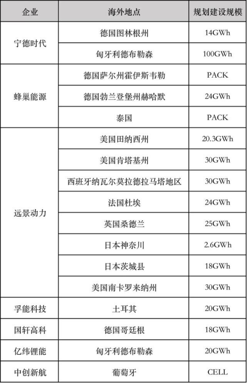 目前,包括寧德時代、中創新航、孚能科技、蜂巢能源、國軒高科、遠景動力、億緯鋰能等中國電池企業都已經在歐洲規劃布局了生產基地。