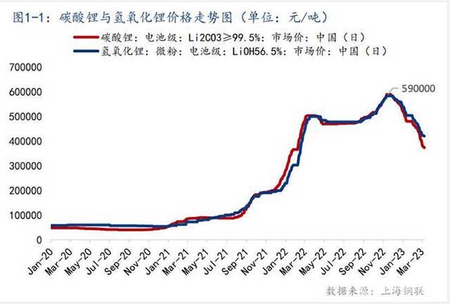 作為鋰電池主要原材料的碳酸鋰,近年價格一直存在波動。2022年,碳酸鋰在動力電池總成本中占比為20%至30%,碳酸鋰價格上漲,直接推動動力電池生產成本飆升,電池級碳酸鋰的價格一度高達60萬元/噸。然而,進入2023年,電池級碳酸鋰價格一路下跌,4月份最低跌破20萬元/噸的關口。