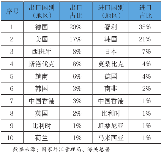 從國別上看,新能源電池企業主要出口至歐洲、美國、東南亞等地,其中,對德國出口占比20%,對美國出口占比17%,位列第1、第2。進口方面,新能源電池企業進口主要來自南美洲、東南亞等地,其中,智利是碳酸鋰的主要來源國,進口占比達35%,而自韓國、日本進口的原材料主要為隔膜和繼電器(表2)。