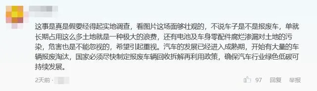 此前有報道,個別城市郊區(甚至主城區內)堆放有大量廢棄新能源汽車。未被規范報廢、回收的新能源車輛,放在城市空地上成為公共垃圾。幾年堆積下來,官方難以處理,不僅占用土地資源,還由于搭載電池,造成比一般垃圾更嚴重的環境污染。