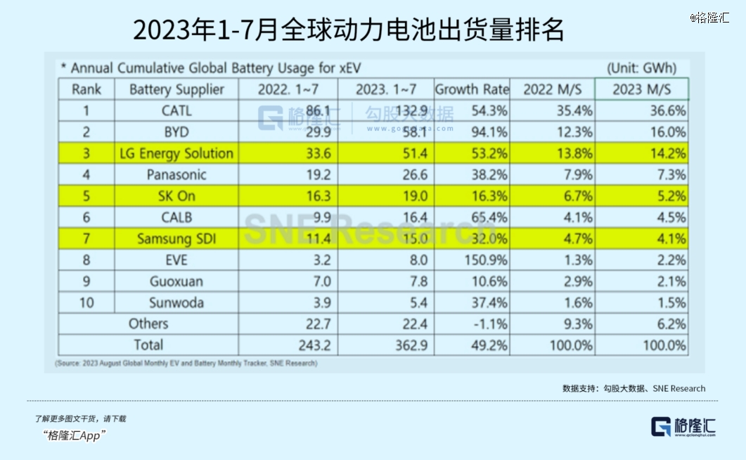 出貨量前十名除了寧王依然守著三成份額外,日韓系企業(yè)的份額比去年同期下滑了2.3個百分點,反映了中系電池企業(yè)集中度持續(xù)提升。