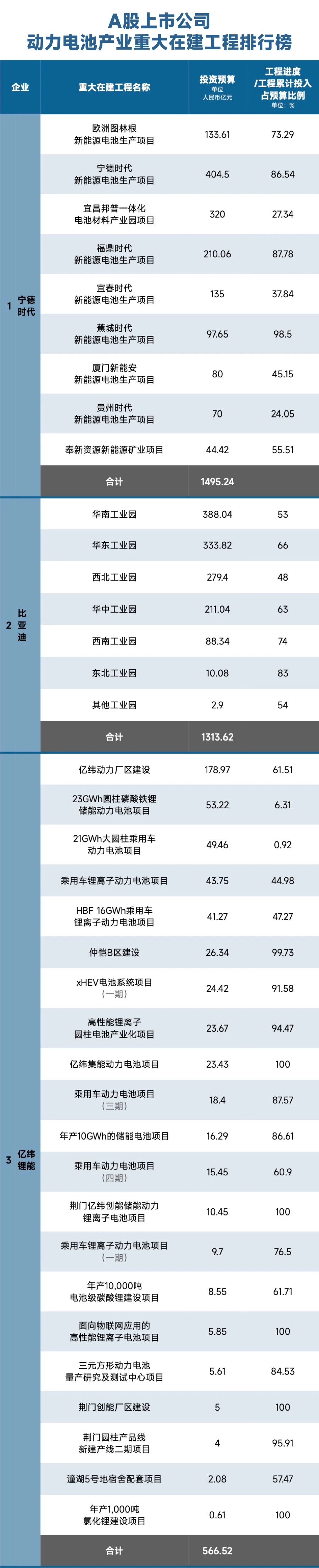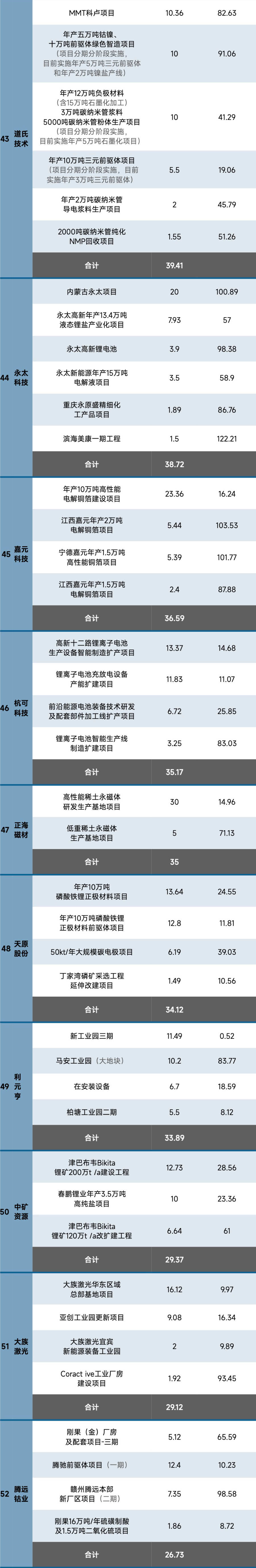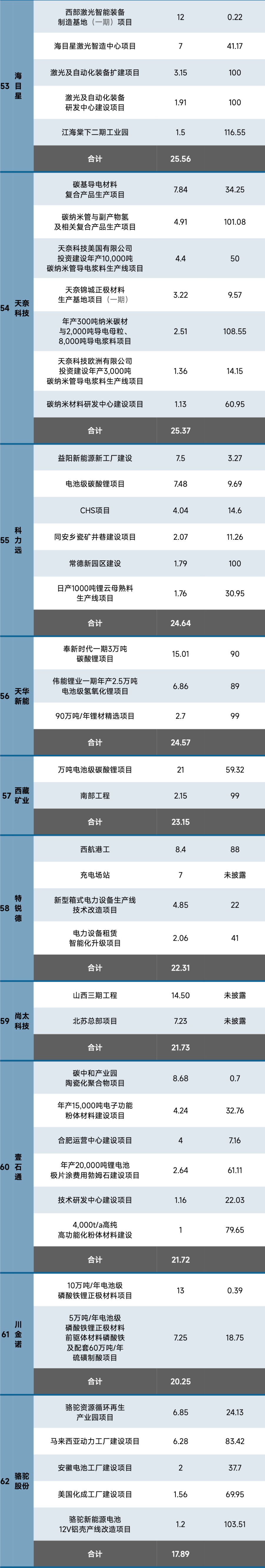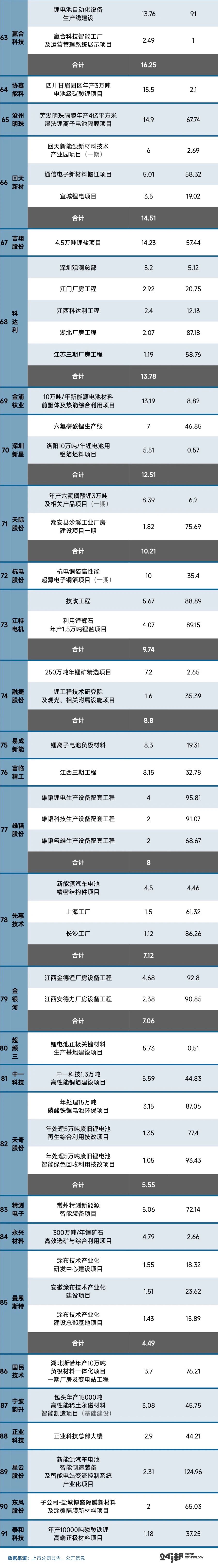 另外24潮團隊分析財報發現,截至2023年6月末,91家新能源上市公司已有450個覆蓋整個動力電池產業鏈的重大項目已進入建設/執行階段,這些項目總投資預算超9100億元。其中,17家企業在動力電池產業鏈投資規模在100億元以上,寧德時代、比亞迪與億緯鋰能高居前三名。
