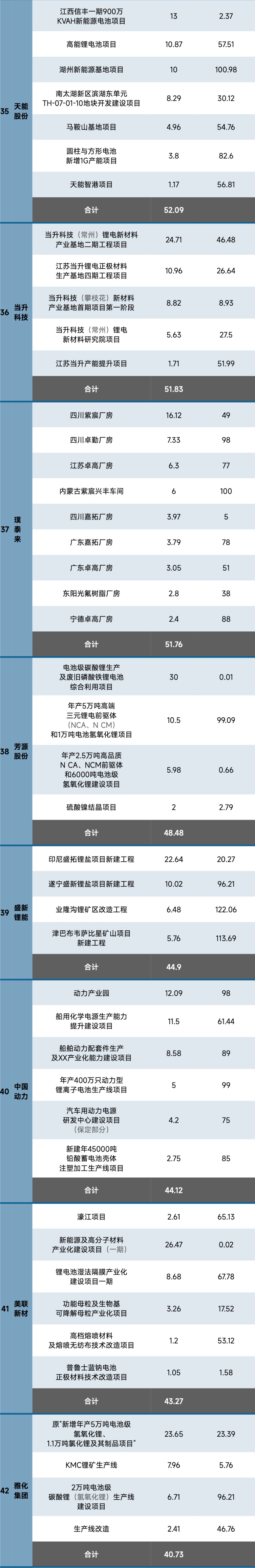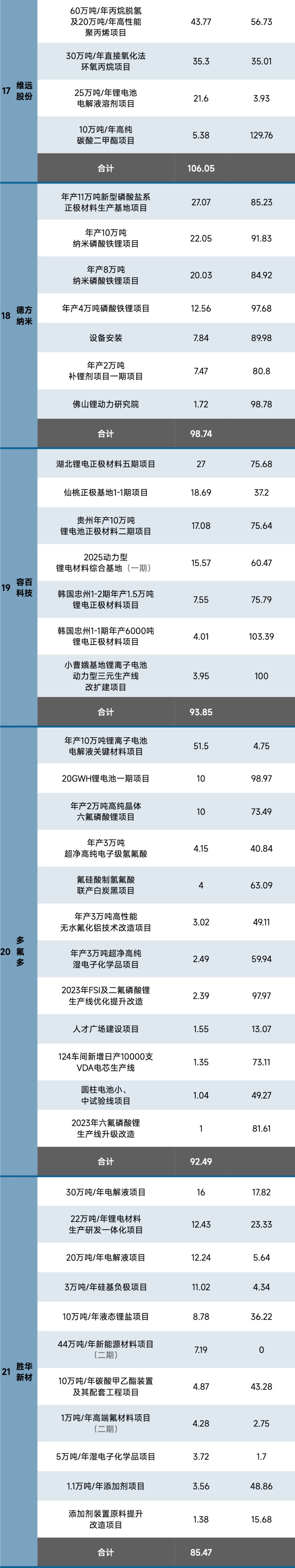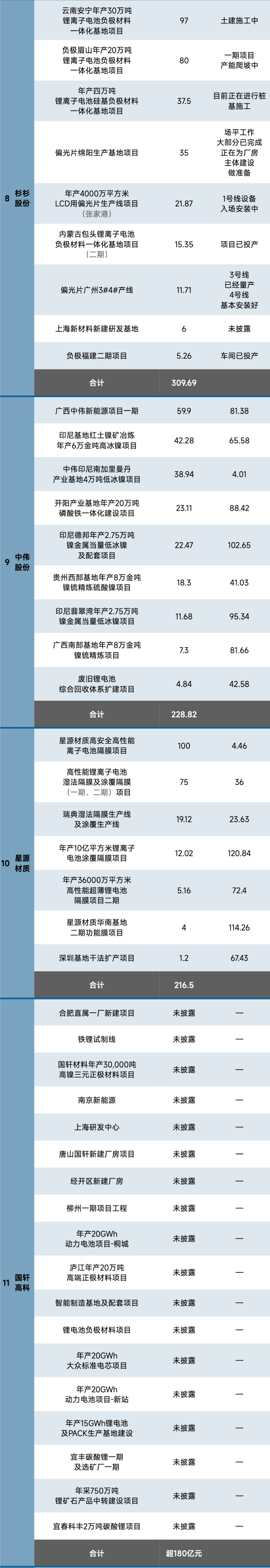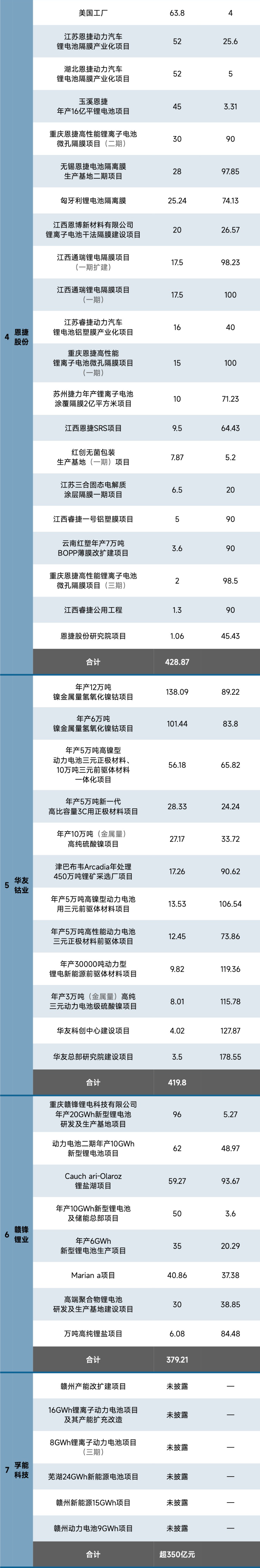 另外24潮團隊分析財報發現,截至2023年6月末,91家新能源上市公司已有450個覆蓋整個動力電池產業鏈的重大項目已進入建設/執行階段,這些項目總投資預算超9100億元。其中,17家企業在動力電池產業鏈投資規模在100億元以上,寧德時代、比亞迪與億緯鋰能高居前三名。