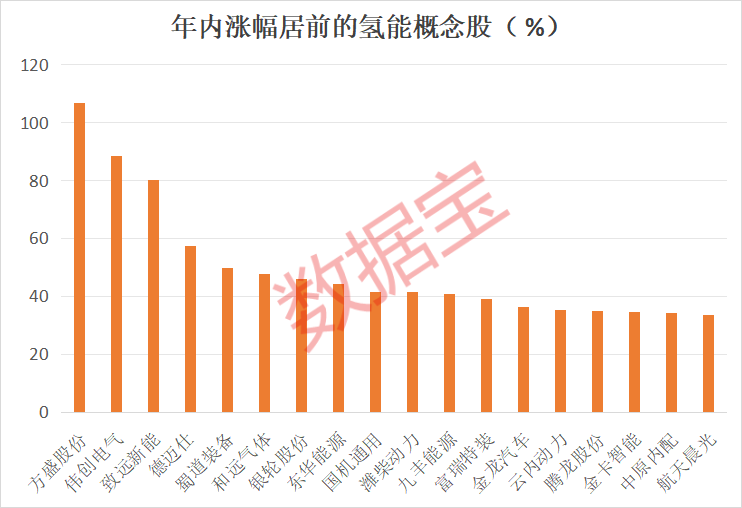 證券時報·數據寶統(tǒng)計,氫能概念股年內平均下跌0.6個百分點,在上漲的個股中,方盛股份、偉創(chuàng)電氣、致遠新能今年以來累計漲幅超過80%。蜀道裝備、東華能源、金龍汽車、云內動力等15股今年以來累計漲幅超過30%。