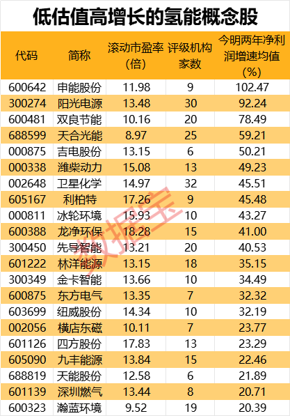 上述低估值個股哪些未來具備高增長潛力?根據5家以上機構一致預測,21只氫能源概念股今后兩年凈利潤增速均值有望超過20%。2只千億市值的行業(yè)龍頭入圍其中,包括陽光電源、濰柴動力。