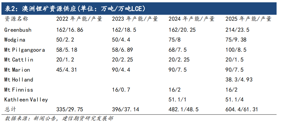 2023年澳洲在產鋰礦主要有格林布什礦、沃吉納礦、P礦、卡特琳礦、馬里森礦以及芬尼斯礦,格林布什礦目前正處于產能釋放周期,沃吉納礦計劃在2024年產能擴大至75萬噸;P礦預計其2024年產能將增加至68萬噸;馬里森礦在2023年擴產落地后產能擴大至90萬噸;2023年在產產能397.3萬噸,在2024、2025年分別有凱瑟琳谷項目、芒特霍蘭項目投產,疊加在產擴產的產能擴建,預計2024、2025年澳大利亞鋰礦產能將分別達到483.4萬噸、605.7萬噸;預計2023-2025年澳洲鋰礦產量分別為39、50、65萬噸LCE