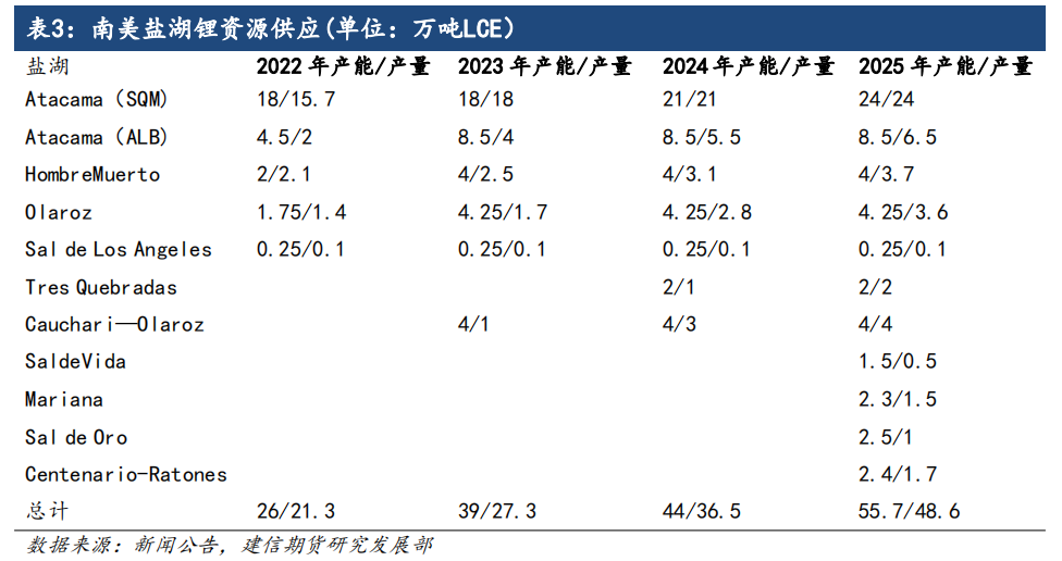 南美鹽湖項目在2023-2024年迎來集中投產期,目前南美在產鹽湖主要分布在智利和阿根廷,智利在產鹽湖僅有阿塔卡瑪鹽湖,Atacama(SQM)擴建工程推遲至2024年底達產;相較于智利鹽湖產能大產量集中,阿根廷鹽湖相較分散,目前阿根廷在產鹽湖4個,Livent的HombreMuerto(Fenix)年底預計完成二期1萬噸產能建設;Olaroz鹽湖2.5萬噸LCE和Cauchari-Olaroz鹽湖4萬噸LCE均已產出碳酸鋰,并將在下半年開始產能爬坡。2023年南美鹽湖產能增量13萬噸,產量增量6萬噸,2024年前期投產產能釋放,疊加Atacama(SQM)產能擴產以及紫金3Q鹽湖投產,預計2024年產量增量為9.2萬噸。