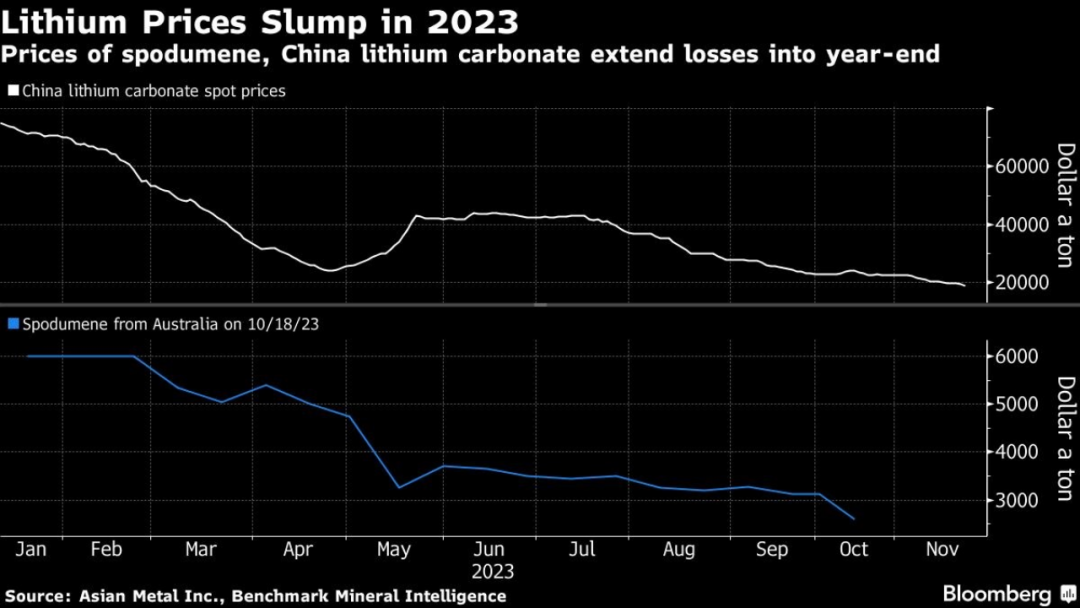 (中國電池級碳酸鋰和澳洲鋰精礦價格走勢圖。圖源:彭博社)