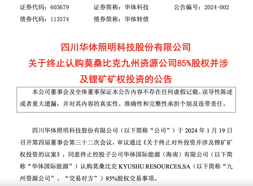 比如,以城市智慧新場景和照明為主業的華體科技在1月19日晚間作出決定,終止認購莫桑比克九州資源公司(KYUSHU RESOURCES,SA)85%股權并涉及鋰礦礦權投資。