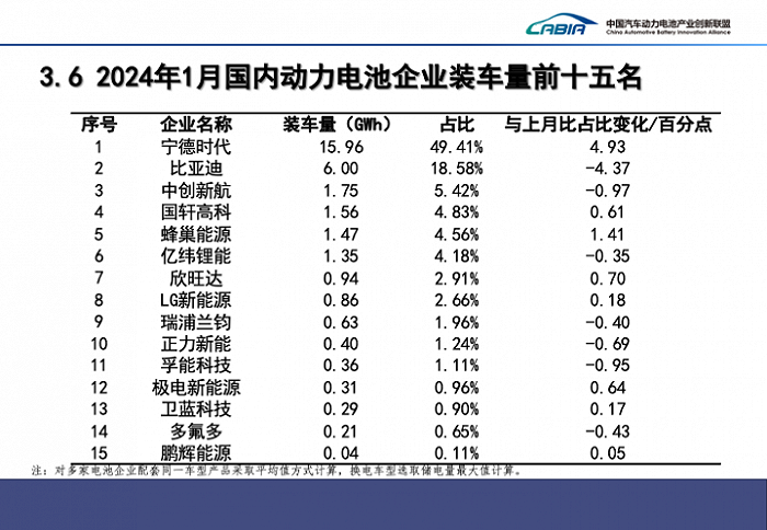 2月7日,中國汽車動(dòng)力電池產(chǎn)業(yè)創(chuàng)新聯(lián)盟公布最新數(shù)據(jù)顯示,今年1月,寧德時(shí)代國內(nèi)動(dòng)力電池裝車量達(dá)15.96 GWh,市占率為49.41%,穩(wěn)居榜首。若以每輛新能源車搭載50 KWh電量(50度電)計(jì)算,上述動(dòng)力電池可配套超31萬輛新能源汽車。