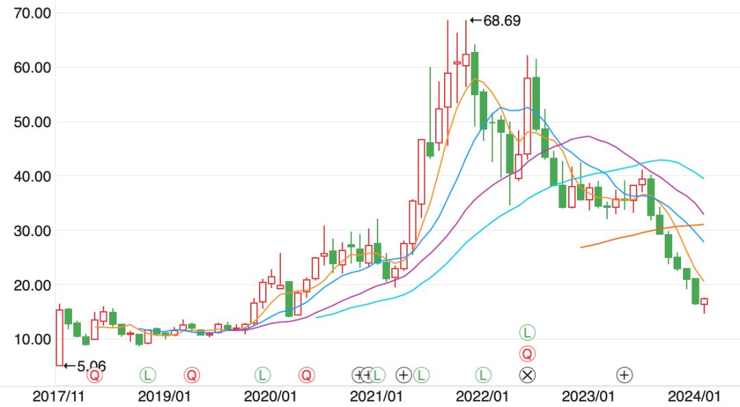 杉杉股份的股價從43.67元每股的歷史高位,跌到2024年2月22日的11.30元。璞泰來的股價,從68.69元每股的歷史高位,回落到2月22日的17.32元每股。貝特瑞的股價,從2021年的87.65元每股,跌到2月22日的18.80元每股。