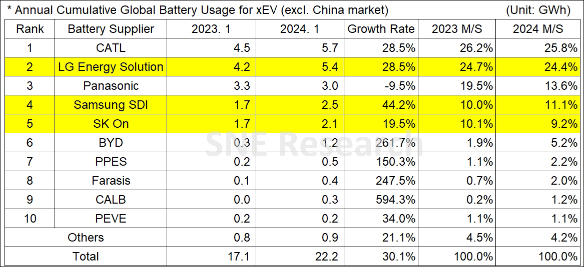 韓國三星SDI以同比增加44.2%的2.5GWh位居第四,占有率達到11.1%;SK on以同比增長19.5%的2.1GWh占據9.2%的市場,位居第五。韓聯社8日報道說,算上SK新能源,韓國三大動力電池制造商在中國以外市場的裝機量同比增長,但市占率總和同比下降0.1%,為44.7%。