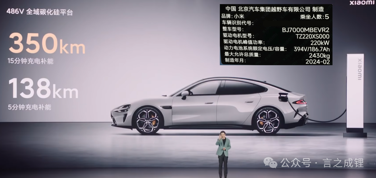需要注意的是,按照SU7標準版的銘牌來看,其電池容量為186.7Ah, 電壓為394V, 按照磷酸鐵鋰電池最高3.65V的電壓上限,其最高電壓為450V左右,正好在486V碳化硅平臺以內。