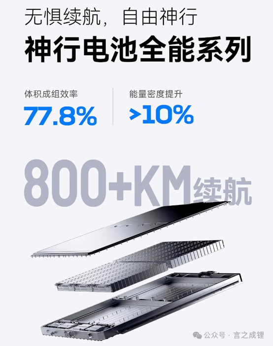 在小米SU7發布的同一天,CATL的官方公眾號也正式公布了神行電池全能系列,宣傳語為“無懼續航,自由神行” 并且著重強調了高達77.8%的體積成組效率以及超過10%的能量密度提升(參考歡迎新同學),考慮到此前刀片電池的系統能量密度為150Wh/kg, 超過10%的提升與上面分析的157Wh/kg也比較接近。
