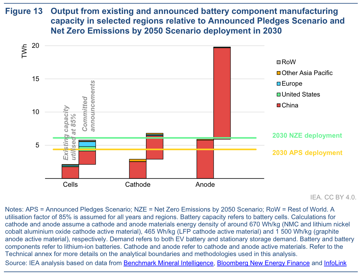 鋰離子電池的制造需要穩定、高質量的陰極和陽極材料供應。它們的生產主要集中在中國,目前中國的陰極活性材料產能占全球產能的近90%,陽極活性材料產能超過97%。到2030年,中國仍占陰極和陽極活性材料承諾新增產能和初步新增產能的85%以上。然而,不同的電池化學成分需要不同的供應鏈,磷酸鐵鋰(LFP)技術主導著中國市場,鎳錳鈷氧化物鋰(NMC)技術主導著歐洲和北美市場。中國擁有約100%的LFP產能;占NMC的產能四分之三,其次是韓國,約占20%。未來幾年,中國制造商面臨的主要挑戰將是找到足夠大的出口市場,以利用其巨大的制造能力盈余,提高目前較低的利潤率,而歐盟和美國等地區的制造商則需要展示其成本競爭力。不同供應商提供的電池和組件的質量、成本和特性,以及當地含量要求和環境、社會和治理(ESG)標準的規定,將是決定這些市場贏家和輸家的關鍵。
