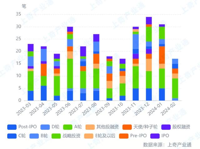 圖112023年03月至2024年02月全國鋰電池融資交易輪次分布