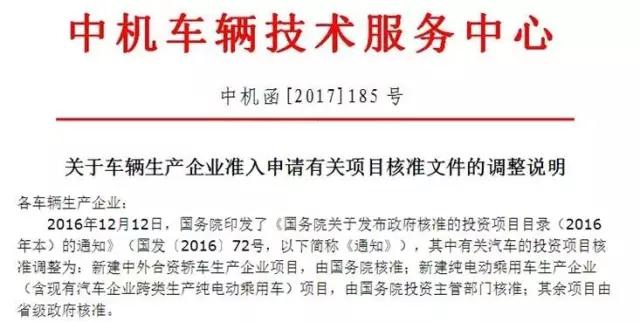 5月23日,中機中心發布《關于車輛生產企業準入申請有關項目核準文件的調整說明》(以下簡稱《調整說明》),為貫徹落實《國務院關于發布政府核準的投資項目目錄(2016年本)的通知》(以下簡稱《(2016年本)的通知》)的要求,經工業和信息化部裝備工業司同意,將車輛生產企業準入申請有關項目核準文件作了如下調整說明: