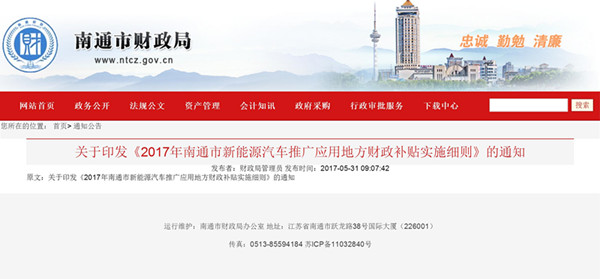 2017年南通市新能源汽車推廣應(yīng)用地方財(cái)政補(bǔ)貼實(shí)施細(xì)則