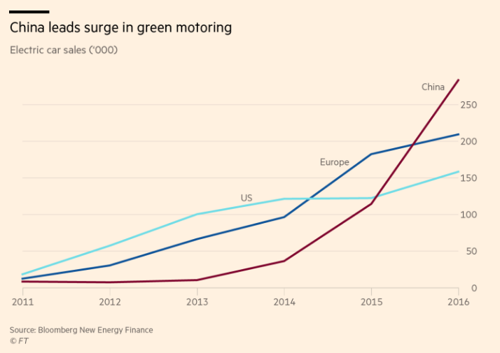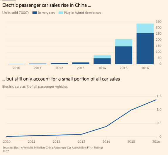 截止到2016年,中國的電動(dòng)車銷量和增速都是世界最快(圖:金融時(shí)報(bào))