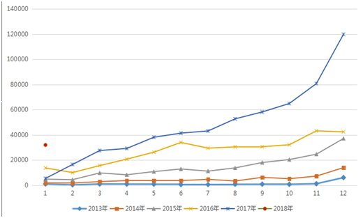 下面分析 2013年到2017年(共4年)新能源乘用車月銷售走勢。2013、2014年基本處于試銷期,到2017年12月上升到12萬輛/月的水平。