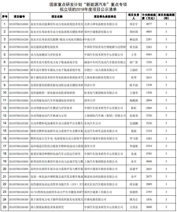 2018年擬立項新能源汽車重點專項公示