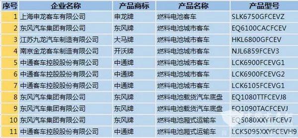 電池產品共5家企業11個型號。中通客車、東風汽車、南京金龍、上海申龍、江蘇九龍在列;其中,東風汽車和中通客車入選車型最多,都有4款產品車型及產品入選。