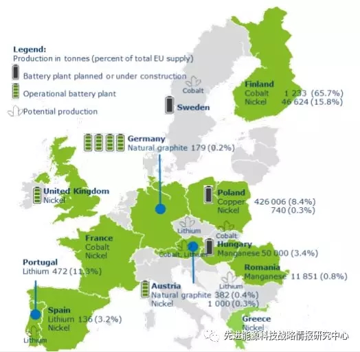 加工和冶金:2010至2014年間,世界精煉鈷年平均產(chǎn)量約為8.34萬(wàn)噸,中國(guó)是精煉鈷的主要生產(chǎn)國(guó)。歐盟精煉鈷主要依靠?jī)?nèi)部生產(chǎn)和從17個(gè)國(guó)家進(jìn)口鈷礦石,其主要生產(chǎn)國(guó)為芬蘭(占全球產(chǎn)量13%)、比利時(shí)(5%)和法國(guó)(<1%)。2010年至2014年間,歐盟年平均進(jìn)口的鋰化合物約含有3600噸鋰金屬,葡萄牙和西班牙年生產(chǎn)約600噸鋰化合物,不用于出口。2010至2014年間全球鎳金屬年平均產(chǎn)量為175萬(wàn)噸,中國(guó)是精煉鎳的最大生產(chǎn)國(guó)。歐盟的芬蘭、法國(guó)和英國(guó)生產(chǎn)精煉鎳。中國(guó)生產(chǎn)全世界70%的天然石墨,其中70%是無(wú)定形石墨、30%是片狀石墨。