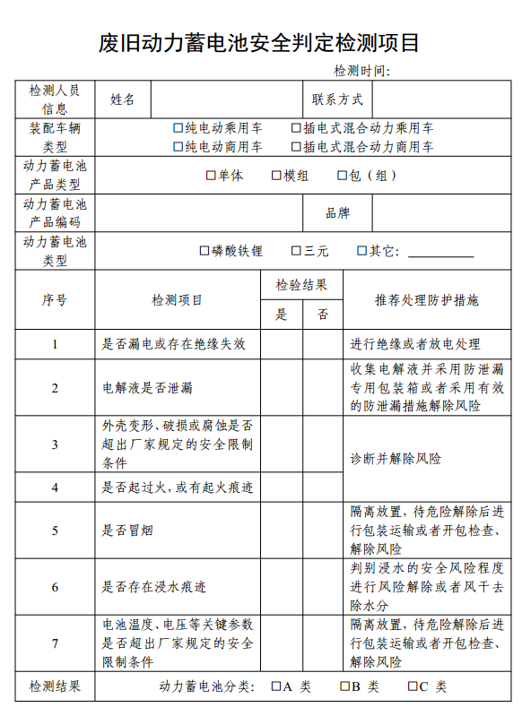 6.2.1 A類:結構功能完好、按附錄A檢測所有條款檢驗結果均為“否”,或經防護處理后重新檢測所有條款檢驗結果均為“否”的廢舊動力蓄電池。