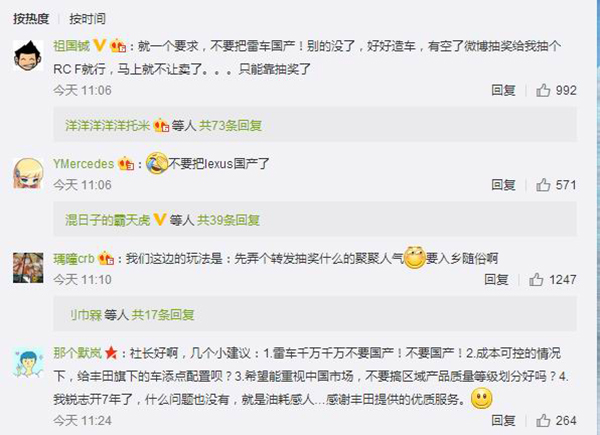 而翻開3600余條評論,非常有趣的是,大部分網友的關注點竟然是“請求”豐田社長千萬不要國產雷克薩斯車型,這條評論得到網友置頂,目前點贊量排名靠前的評論包括“就一個要求,不要把雷車國產!別的沒了,好好造車……”“社長好啊,幾個小建議:1.雷車千萬千萬不要國產!不要國產!”“歡迎歡迎,雷車千萬別國產”等等類似留言。