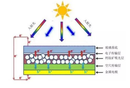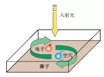鈣鈦礦太陽能電池由導電電極、鈣鈦礦吸光層、電荷(電子和空穴)傳輸層組成。當太陽光入射到電池吸光層后隨即被吸收,光子的能量將原來束縛在原子核周圍的電子激發(fā)。由于物質整體上必須保持電中性,電子被激發(fā)后就會同時產生一個額外的帶正電的對應物,物理學上將其叫做空穴。這樣的一個“電子--空穴對”就是科學家們常說的“激子”。