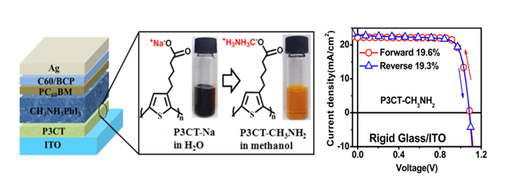 傳統(tǒng)的晶硅太陽能電池光電轉換效率大約介于23%至25%之間。在研究中,方俊鋒團隊采用一種有機材料——具有羧基極性基團的聚噻吩衍生物(P3CT)作為空穴傳輸層,可實現16%以上的光伏轉換效率。方俊鋒說:“在研究中,我們發(fā)現極性羧基的引入讓鈣鈦礦溶液在空穴傳輸層上更容易鋪展,通過抗衡離子調控使得空穴傳輸層界面薄膜更加均勻,效率可從16%進一步提高到19%以上。”