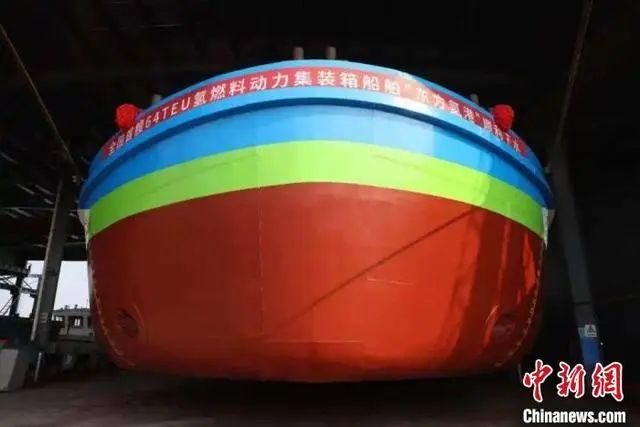 中新網嘉興12月18日電(胡豐盛 陳鵬軍)12月18日,中國首艘內河64標箱氫燃料電池動力集裝箱船舶“東方氫港”號成功下水。