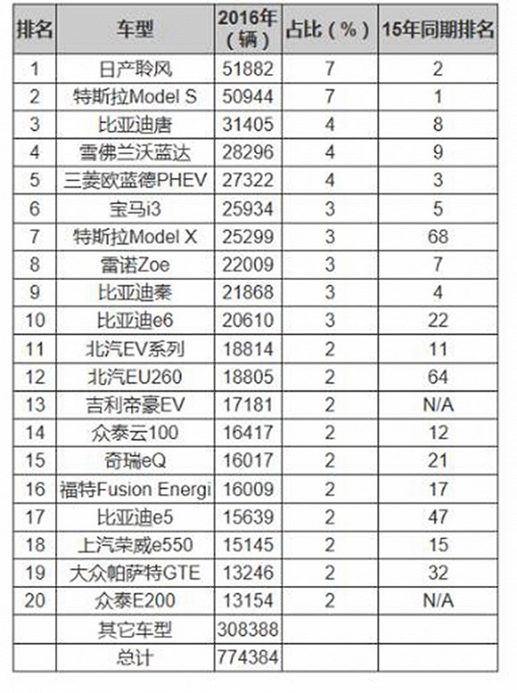 (2016年全球電動車企銷量排行)