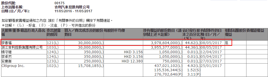 對于公司未來的發展,吉利董事長李書福似乎信心十足。據港交所數據,吉利董事長李書福再次增持3000萬股,這是繼李書福在去年12月份 增持1.65億股之后再一次增持。目前李書福實際持有股數39.79億股,占比44.62%,未來不排除進一步增持可能性。