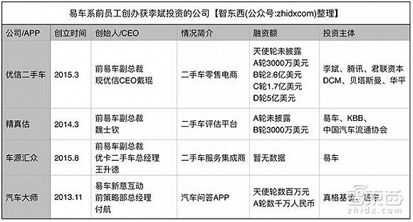 李斌也將這份情商用在了構筑其出行版圖之上。在李斌投資的眾多公司中,還有一支特別的“易車系”,這些公司創始人有一個共同身份——前易車員工。這個隊伍包括了前易車副總裁、現優信CEO戴琨,前易車副總裁、精真估創始人魏士欽,前易車副總裁兼優卡二手車總經理、現車源匯眾CEO王升德,前易車新意互動前策略部總經理、百車寶創始人付航。