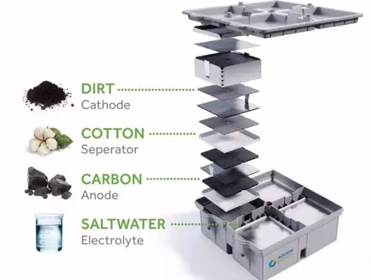 Aquion電池組件的構成:陰極為土(含氧化錳),陽極為碳,電解液為鹽水來源:windpowerengineering.com