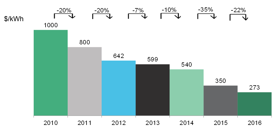 鋰電池成本從2010年以來已經下降了72%來源:彭博新能源財經