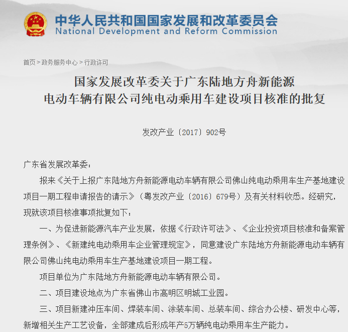2017年5月18日,從國(guó)家發(fā)展改革委網(wǎng)站獲悉,國(guó)家發(fā)展改革委正式公示關(guān)于廣東陸地方舟新能源