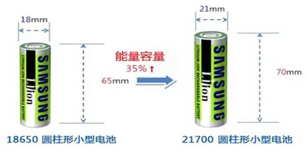 在此種背景下,業界認為,18650電池已完成了動力鋰電池初級應用階段的歷史使命,為了能夠達到政府規劃的目標,未來更大尺寸、更大容量的鋰電池型號將會興起,比如21700電池。
