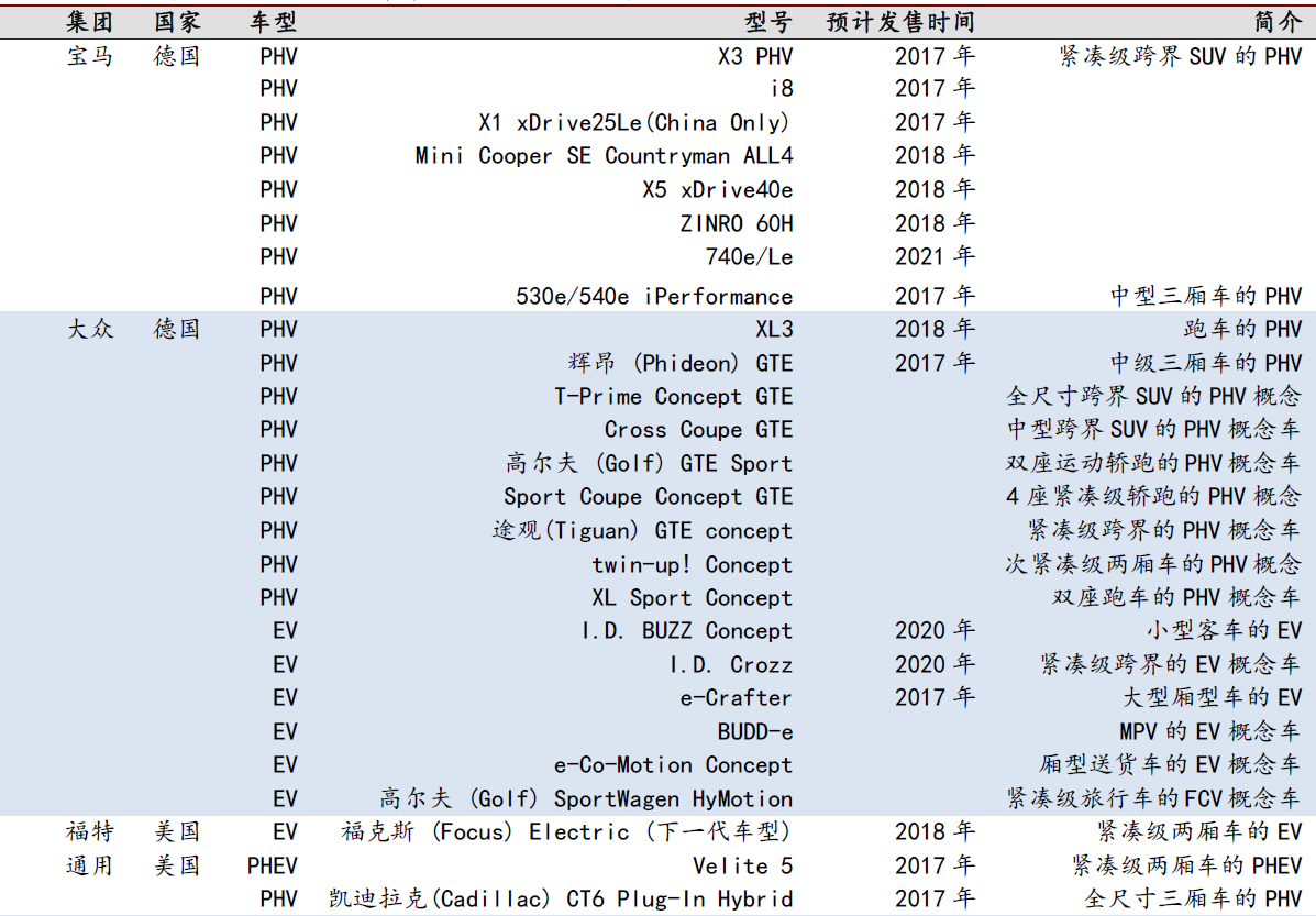 德系先行,十大廠商新能源汽車將在2018至2019年開始大規模放量。截至2016年底,全球前10大廠商共計發售新能源車型約42款(僅含EV、PHEV),其中德系車22款,占比超過50%。而根據各大廠商規劃車型來看,目前已披露正在研發車型共計51 款,其中德系29款,日系12款,韓系7款,美系3款,德系品牌(奔馳、寶馬、大眾)仍占主導。其中在17 年上市的有18款,2018至2020年上市32款。預計,在經歷2017年多款新能源車型上市的鋪墊后,十大集團新能源汽車將從18-19 年開始大規模上量。