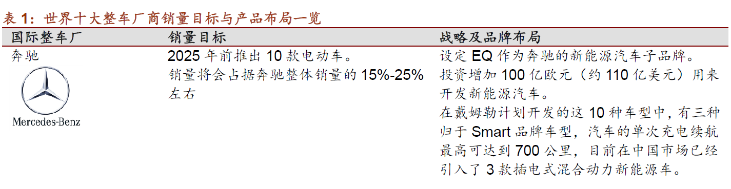 從測算結果來看,根據2025年彈性15%-25%,分別對應新能源汽車總銷量1246至2076萬輛,取滲透率20%,對應2025 年新能源汽車總銷量約1650萬輛,遠高于中國新能源汽車預期總量和特斯拉等公司總量。我們認為,隨著全球十大汽車集團加速布局新能源汽車市場,未來將成為新能源崛起的中堅力量,對中上游產業鏈的帶動將起到決定性作用。
