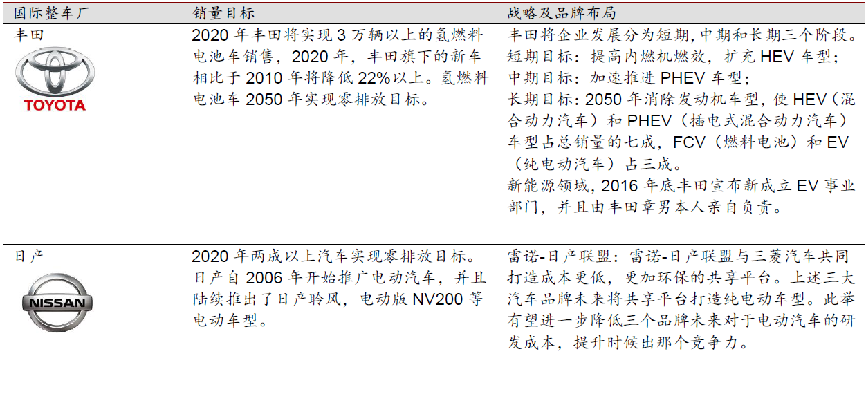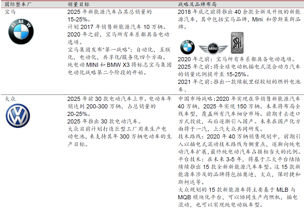 目標2025年滲透率15-25%,十大汽車集團是未來新能源汽車放量的關鍵。自2016年下半年以來,全球汽車巨頭開始加速布局新能源汽車,并制定了一系列發展戰略和銷量目標。我們統計了全球十大汽車廠商的目標后發現,除通用和本田未提出明確新能源汽車銷量目標外(通用:2020年前推出10款,本田:2020年推出PHEV車型),其他集團規劃目標都為2025年新能源汽車銷量占比15至25%,預計第一批新能源車型將在2018至2019 年集中釋放。招商證券認為,未來新能源汽車大規模放量的核心在于全球汽車巨頭,相對于特斯拉從“零”做起的方式,傳統汽車巨頭具有上游成熟供應鏈體系到下游穩定渠道和客戶的絕對優勢,疊加自身的品牌效應,2025年達到新能源汽車滲透率15至25%相對合理。