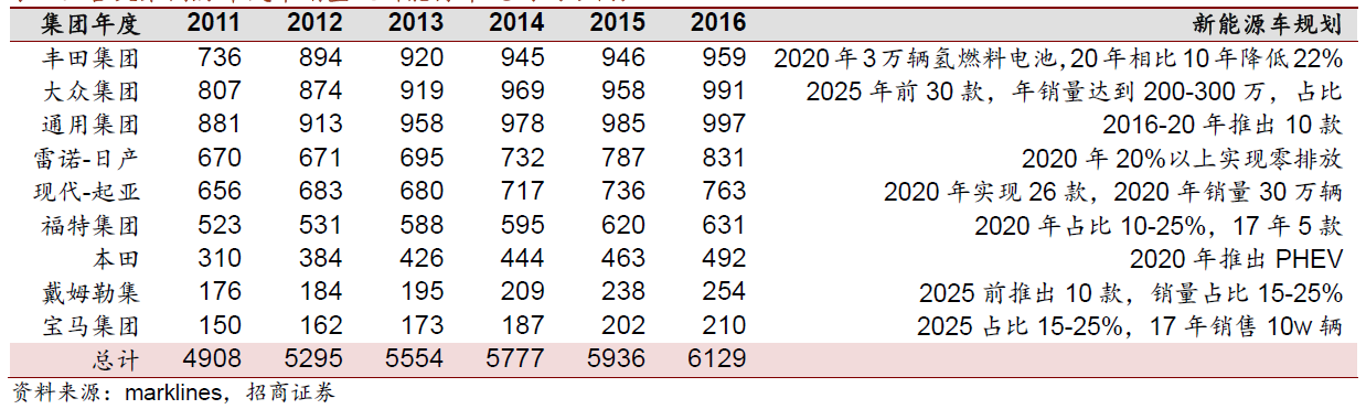 2016年中國新能源汽車銷量51.9萬輛,同比增速56.8%,規劃2020年目標產銷200萬輛。隨著中國新能源汽車的快速放量和汽車新銳特斯拉model 系列快速投產的催化作用,全球各大汽車巨頭紛紛開始布局新能源汽車,特別是德系新能源汽車的大規模投放,大大加速全球電動化趨勢。