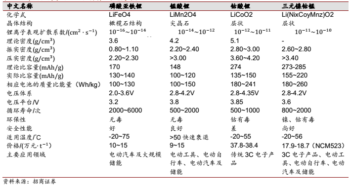 常見鋰離子電池正極材料及性能參數
